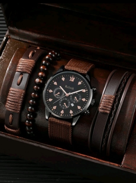 Relógio castanho com acessórios